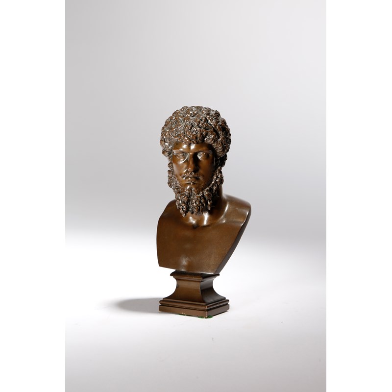 After the antique. A late 19th century French bronze Grand Tour bust of Lucius Verus by Barbedienne, on a waisted socle, inscribed 'F. BARBEDIENNE. FONDEUR' and with an 'A. Collas' pastille, 17.7cm high.