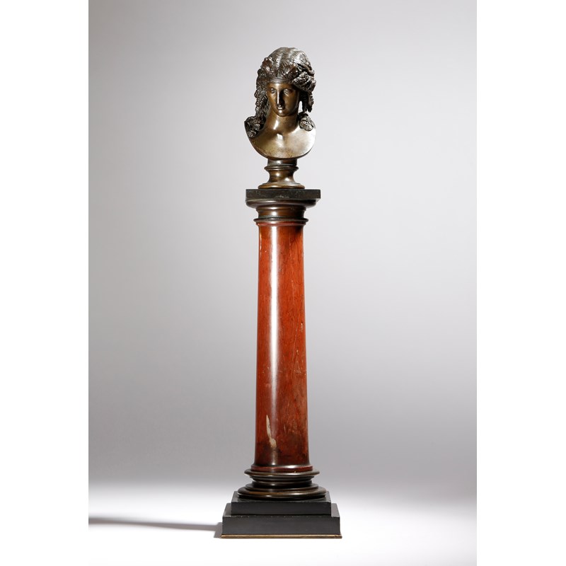 After the antique. A mid-19th century French bronze Grand Tour bust of Ariadne, stamped 'G S' for Georges Emile Henri Servant (French 1828-1890), on a turned socle and a bronze and rosso antico marble column, 48.9cm high.