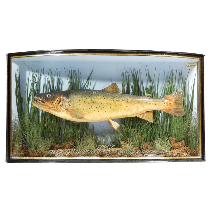 Taxidermy. An Edwardian preserved trout by J. Miller, mounted in a naturalistic setting, with a printed trade label, inscribed 'Mounted by J. E. Miller, 19 New Station Street LEEDS', in a glazed, ebonised bowfront case with gilt lettering, inscribed 'TROUT Caught by H. HOPTON at Ripon, 20th April 1908, Wgt 2 3/4lbs, 34.2cm high, 62.7cm wide.
