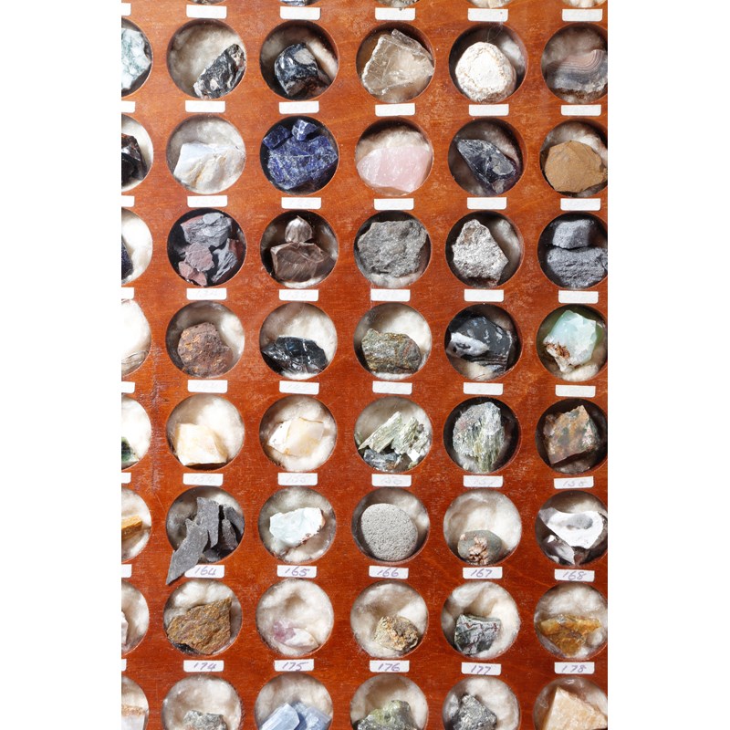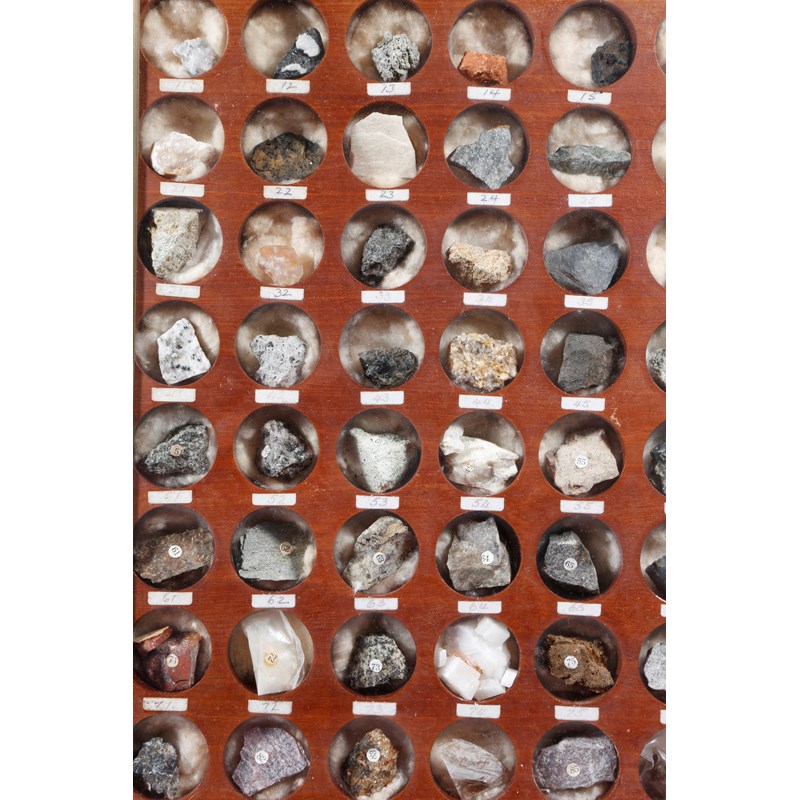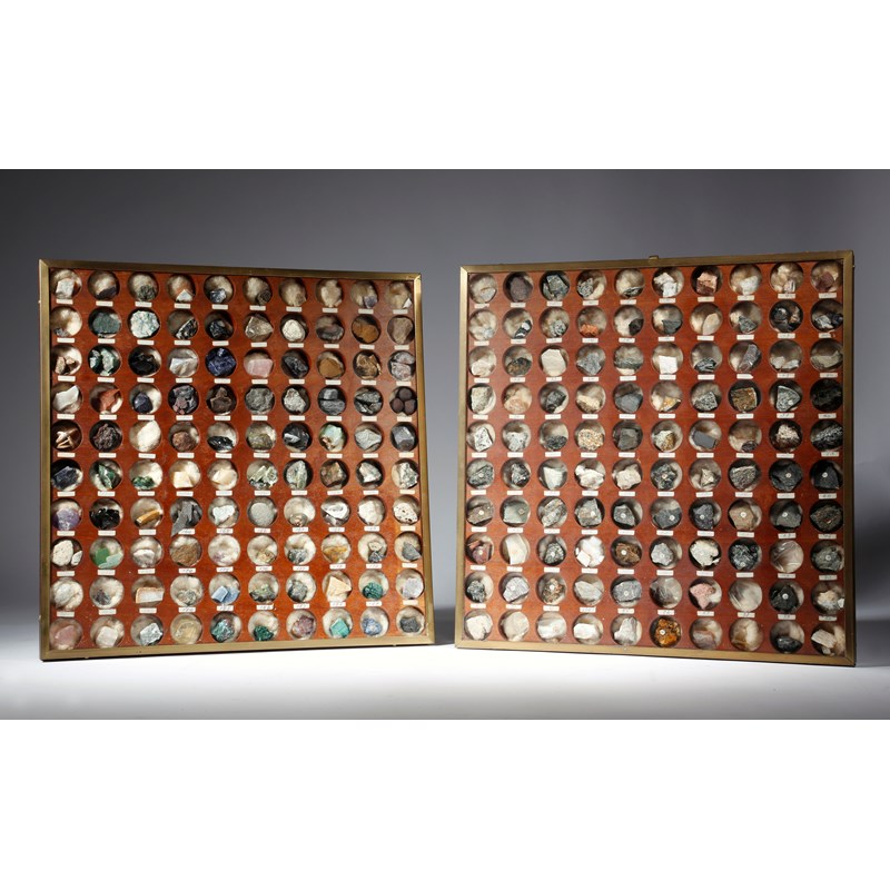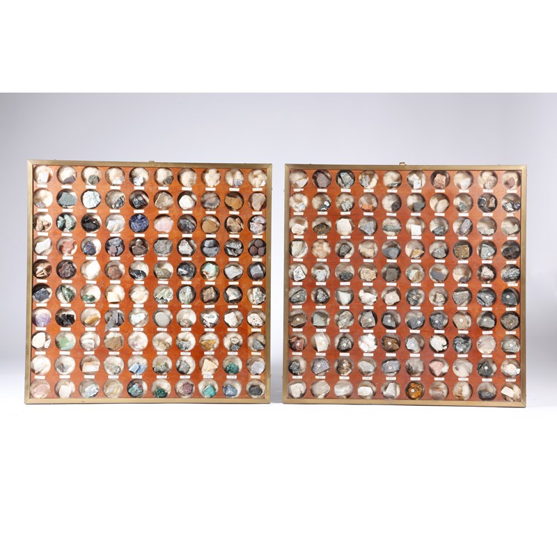 A pair of wall hanging mineral display cases, each containing one hundred numbered mineral specimens, including: tiger eye, obsidian, goldstone, purple fluorspar, sulphur, basalt and jasper, the backs with a handwritten numbered key, each in a glazed brass mounted mahogany frame, 38.5cm square. (2)