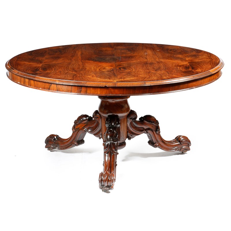 λ A William IV rosewood breakfast table, the circular tilt-top with a moulded edge, on a baluster turned stem, on scroll and cartouche carved legs and brass castors, 72.4 x 136cm.