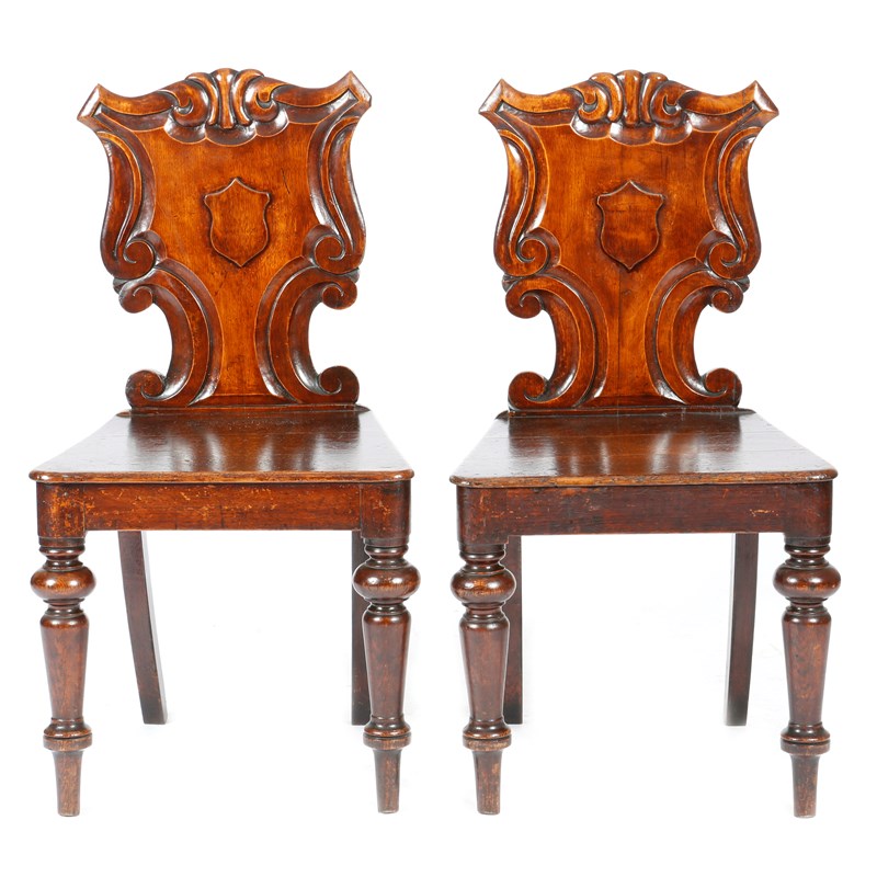 A pair of Victorian oak hall chairs, each with a scroll carved back, centred with a vacant shield, on turned front legs, possibly Irish. (2)