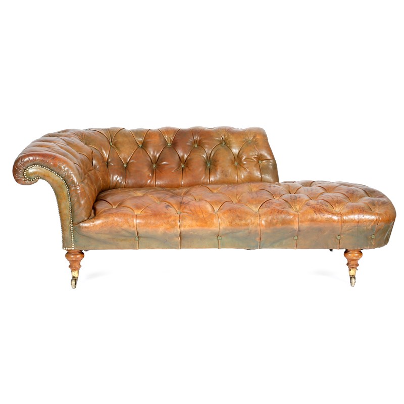 A Victorian day bed, later button upholstered with leather, on walnut supports and brass caps and castors, stamped 'COPE COLLINSON PATENT', inside of the back left leg stamped '4532', 64cm high, 186cm long, 103cm deep.