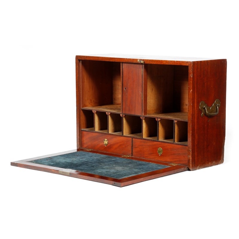 An early 19th century mahogany campaign tabletop desk, the hinged fall revealing an interior with pigeonholes, a cupboard enclosing a drawer with a bone handle, with two further drawers with sunken brass military style handles and with a plush lined writing surface, with brass side carrying handles, 49.3cm high, 73.2cm wide, 26.2cm deep.