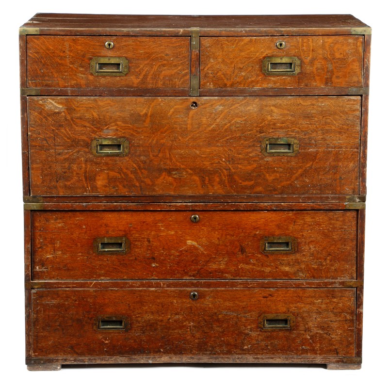 A Victorian oak campaign chest, in two halves, with brass mounts fitted with two short and three long drawers and sunken brass military handles, 100.8cm high, 98.6cm wide, 47.6cm deep.
