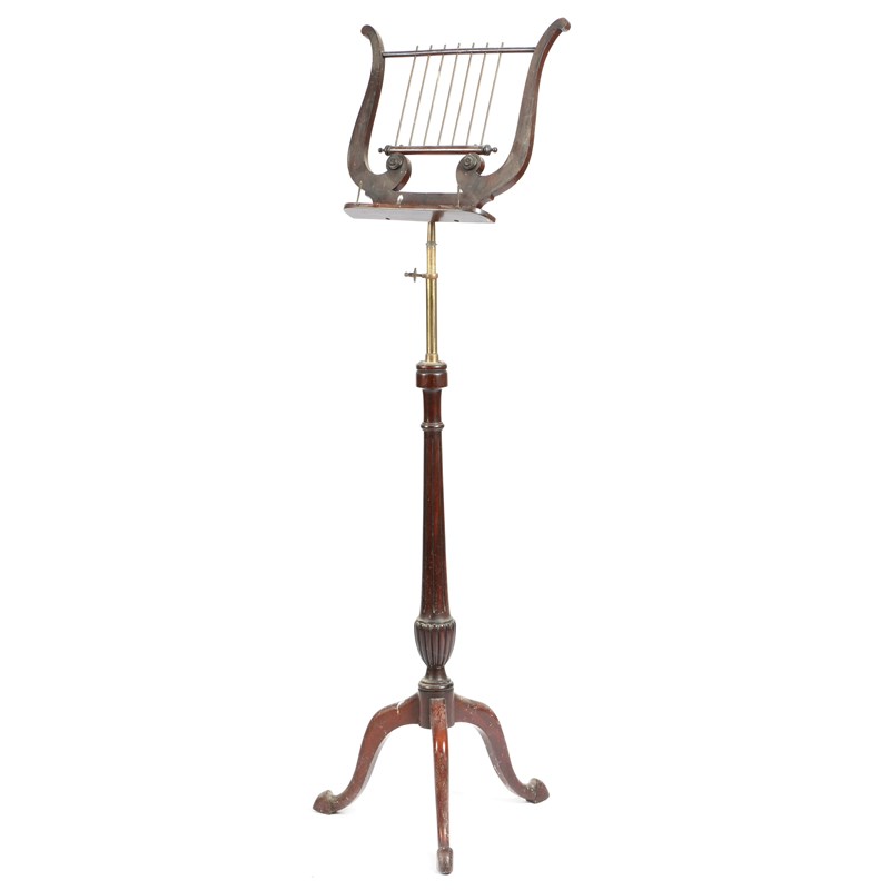 A mahogany and brass music stand in Regency style, the lyre rest on an adjustable brass stem, on tripod supports, 172.5cm high (max), 43.2cm wide.