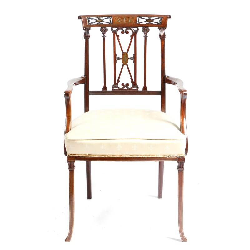 λ A late Victorian mahogany and brass inlaid open armchair, the scroll top rail centred with a rosewood tablet flanked by a pair of pierced foliate panels, with scroll carved splat back, above a stuffed-over seat.