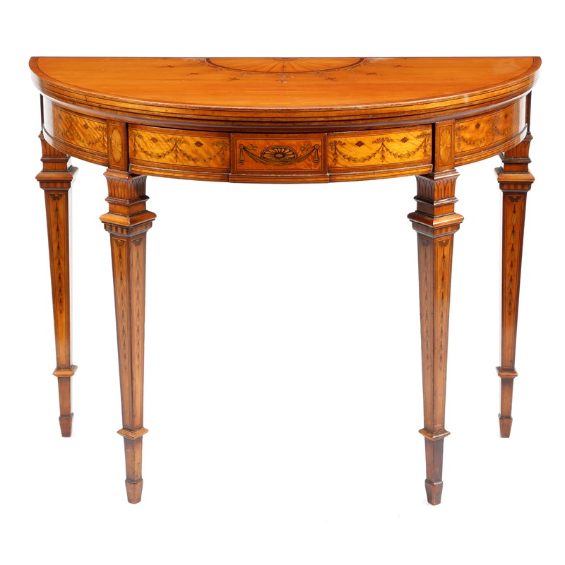 A late Victorian satinwood and marquetry demi-lune card table by Filmer, the crossbanded fold-over top inlaid with a fan and palmettes, above a panelled frieze decorated with husk swags and paterae, with a frieze drawer, on square tapering legs, the underside applied with an enamel plaque inscribed 'T. H. FILMER & SON, 31 & 32 BERNERS STREET, LONDON W. 1., CABINET MAKERS & UPHOLSTERERS', 74cm high, 94cm wide, 47cm deep.