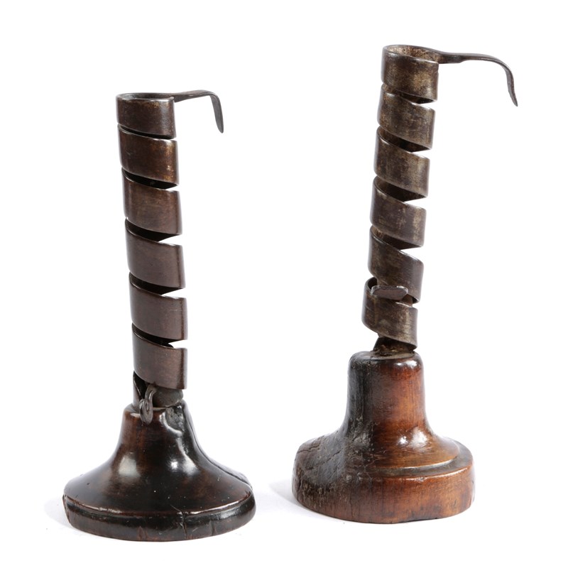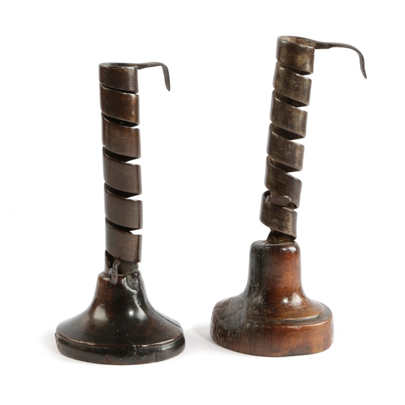 TWO TREEN AND WROUGHT IRON SPIRAL CANDLESTICKS