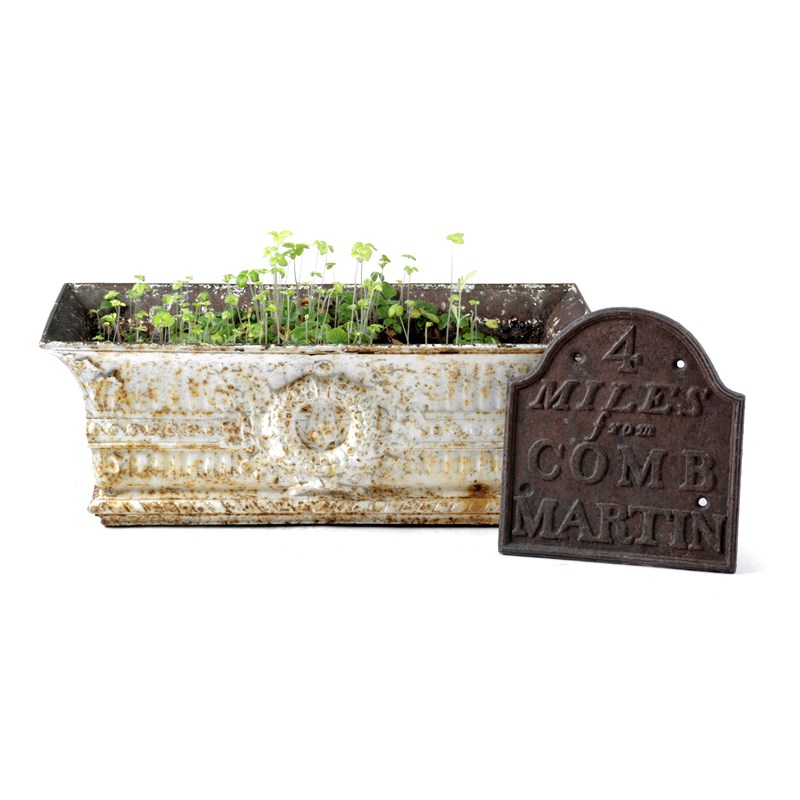 of flaring rectangular form with laurel wreath decoration, together with a cast iron 'Comb Martin' sign (2)