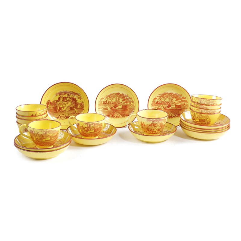 red transfer printed with a man in a fishing punt, comprising: eight tea bowls and saucers, together with three tea cups and saucers red transfer printed with a scene of a couple taking tea in a garden, impressed 'SEWELL' to the saucer bases (22)