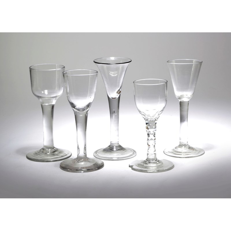 comprising: one with a trumpet bowl and teardrop stem, one with an ogee bowl and plain stem, one with a rounded ogee bowl and plain stem, one with a tapering bowl and plain stem and the other with an ogee bowl with a faceted stem (5)