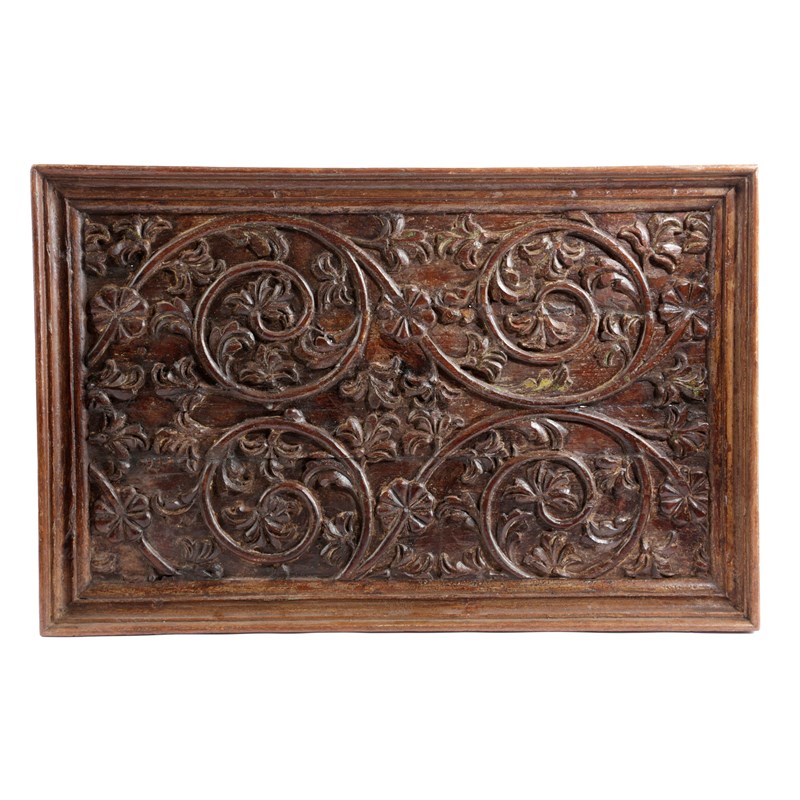 carved with scrolling foliage with the remains of painted decoration, in its original moulded oak frame