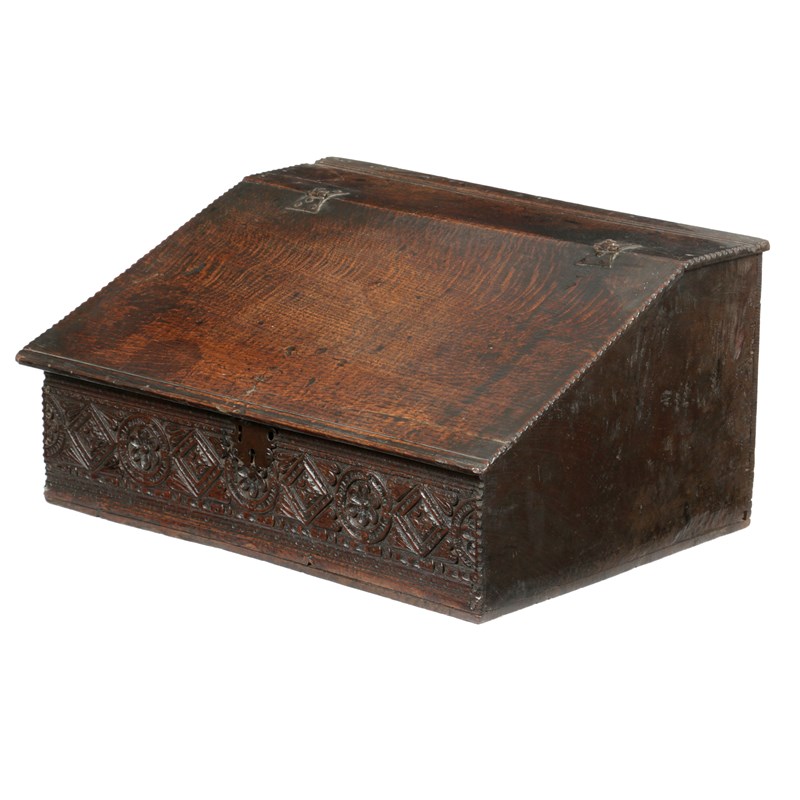 the top with channel moulded and chip carved ends, above a conforming slope, fitted with a channel moulded rear shelf, the front frieze well carved with an alternating run of flowerhead filled rondels and lozenges