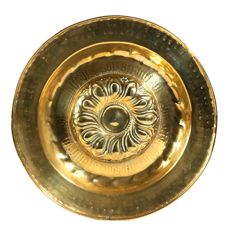the centre with a repoussé whorl boss inside a Gothic script border, the rim with three bands of punched decoration