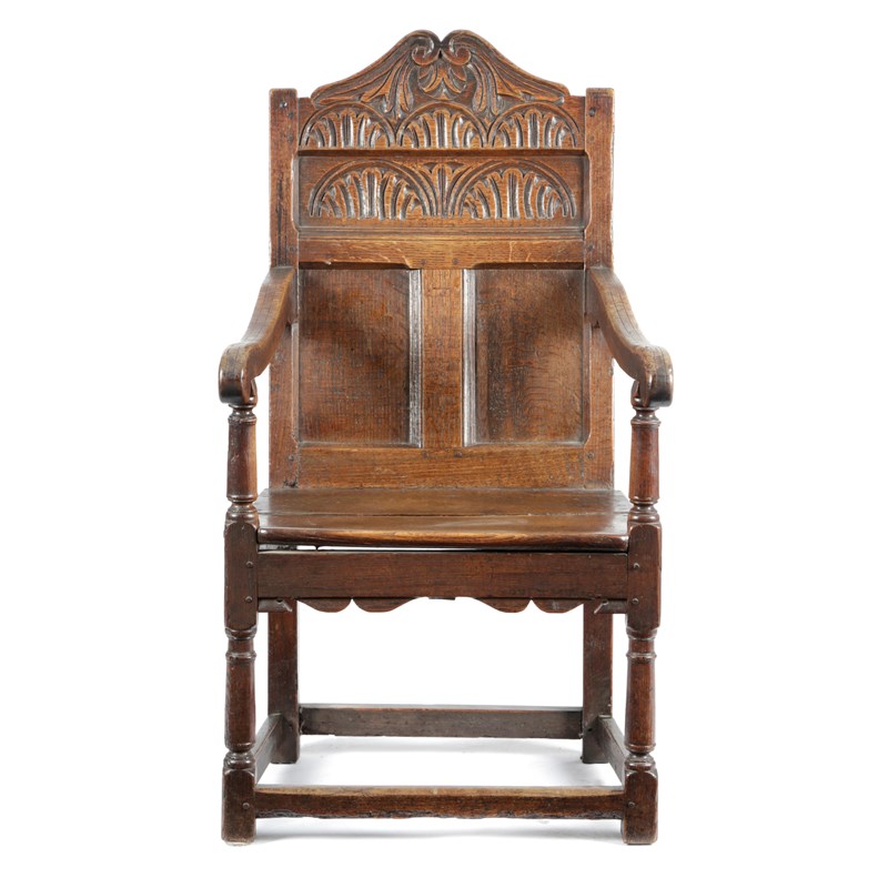 A CHARLES II OAK PANELLED BACK ARMCHAIR