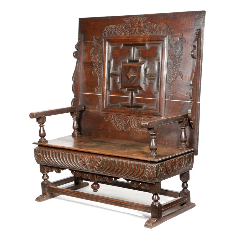 AN EXCEPTIONALY RARE CHARLES II OAK SETTLE TABLE