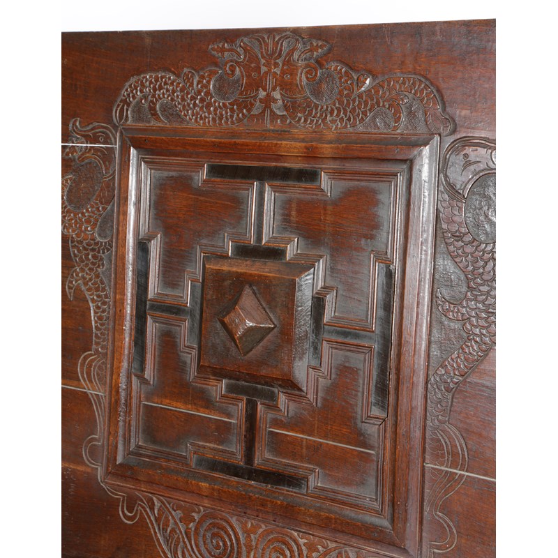 the hinged boarded top carved to the underside with mythical beast around a mitre moulded panel, on baluster turned supports and frieze drawer with gadrooned decoration and on sledge type feet