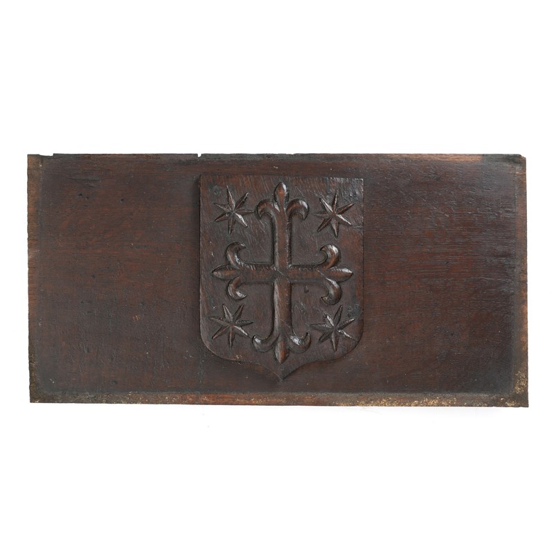 in the form of an heraldic shield centred with a 'cross fleury' with stars to each corner