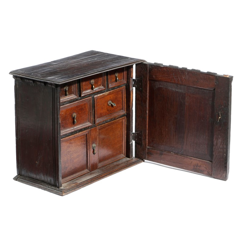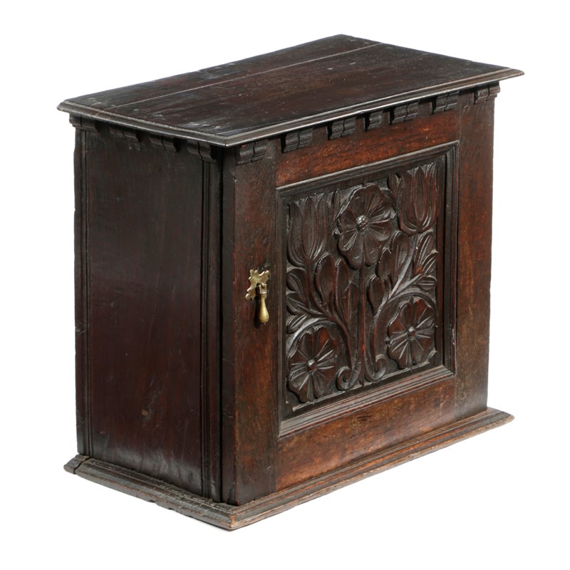 the dentil moulding above a carved panel with tulips and other flowers revealing an interior fitted with six drawers