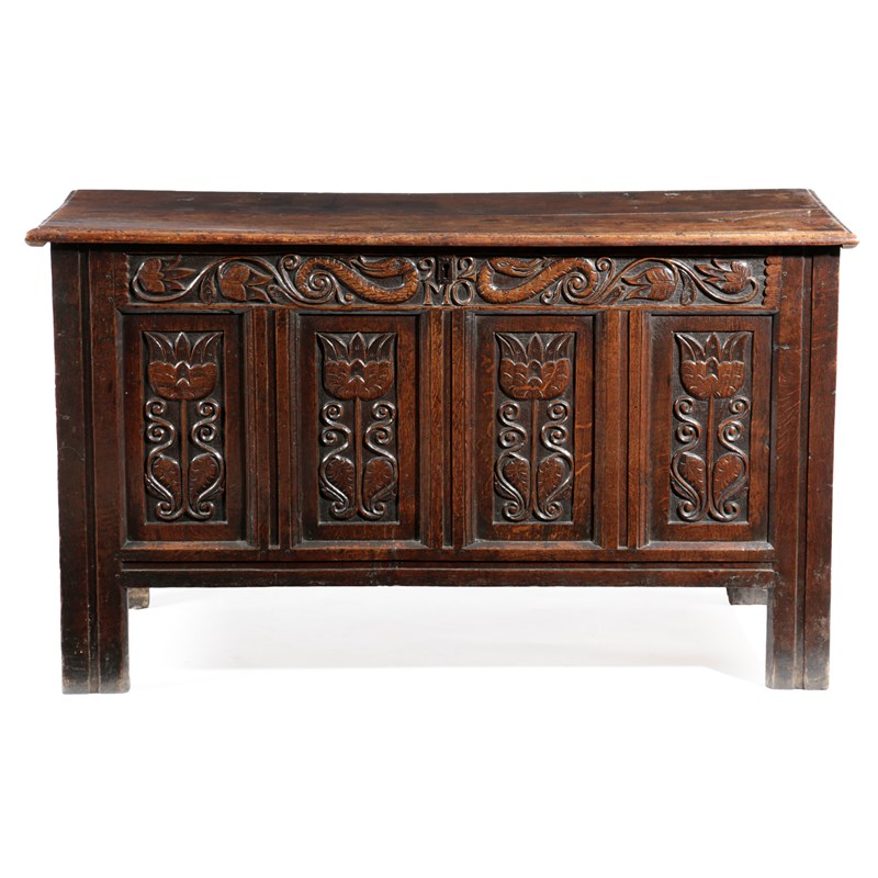 the interior originally with a lidded till and two drawers, the frieze carved with flowers and dragons, with initials and date '92 MO' above quadruple panels of tulips