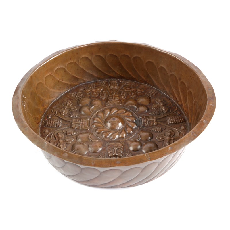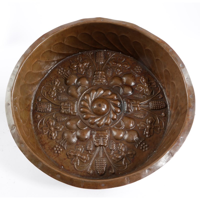 repoussé decorated with a central gadrooned rondel surrounded by lion masks with fruiting vines interspersed by pomegranates, with gadrooned sides and a narrow rim with punched decoration