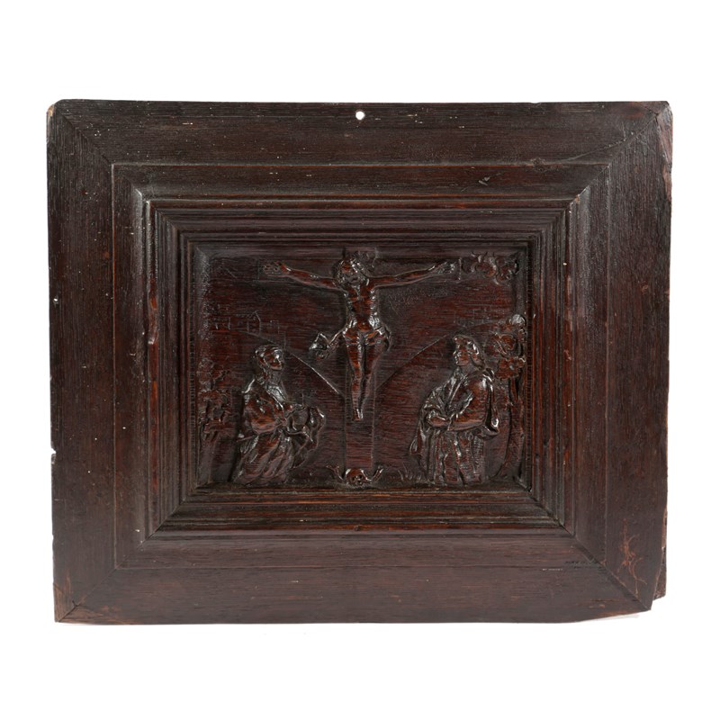 A FLEMISH CARVED OAK CRUCIFIXION PANEL