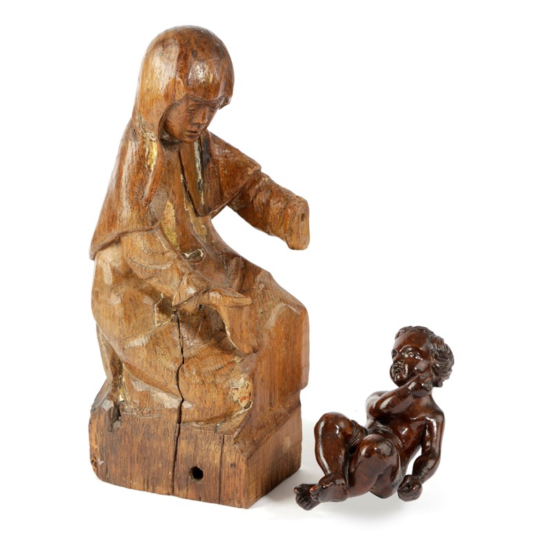 with the remains of painted and gilded decoration, together with a fruitwood figure of a scantily clad child (2)