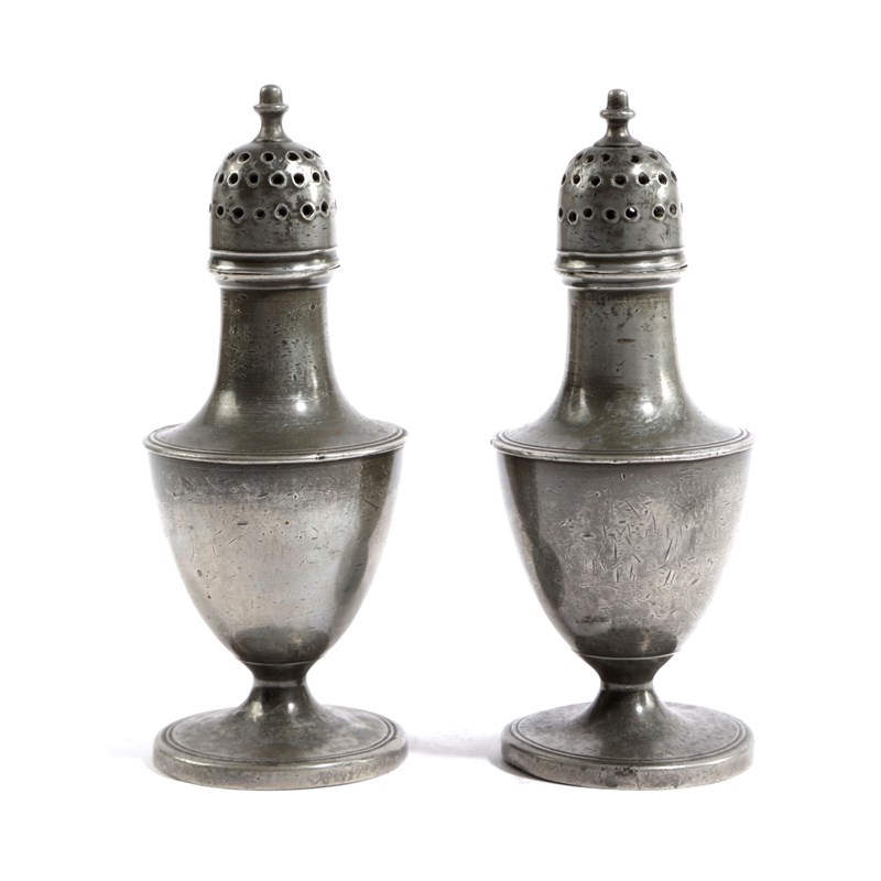 each of urn form, with uncommon, working, rounded lids, unmarked, each plain heavily cast body with a sweeping neck, the screw-on lids with acorn knops and three concentric rings of holes, good detailing of a pair of incised lines to outer edge of lower body and turning lines under the base (2)