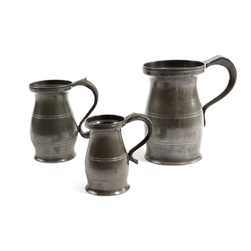 THREE PEWTER LIDLESS MEASURES, PINT, HALF-PINT AND GILL