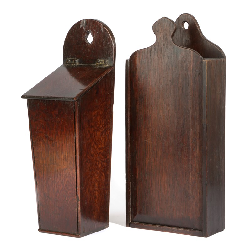 the chamfered cover enclosing a two-section interior, with a pierced backplate, together with an oak candle box, of tapering form with a hinged cover and a lozenge pierced backplate (2)