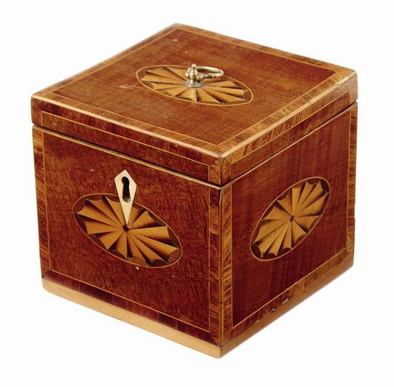 A late George III mahogany and parquetry cube tea caddy, with kingwood crossbanding and stringing, each face with an oval patera, later lined interior, 4.75in (12cm) h, 5in (12.5cm) square. Old restoration.