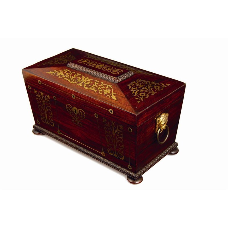 A George IV rosewood and brass marquetry sarcophagus shape tea caddy, with nulled mouldings and a pair of hinged lidded canisters flanking a replaced glass mixing bowl, 7.75in (19.5cm) h, 13in (33cm) w, 6.5in (16.5cm) d. Restoration and minor veneer loss to back.