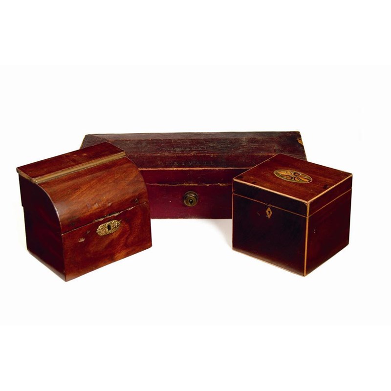 An early 19th century leather bound box, the hinged cover stamped 'Col. Herries, Private', to a marbled paper and velvet lined interior, with paper trade label for 'J Powell, Original Maker, To His Majesty No 341 Oxford Street', and having a brass lock stamped 'I. Bramah, Patent with crown', 13in (32cm) l, and two 19th century mahogany caddies. (3)