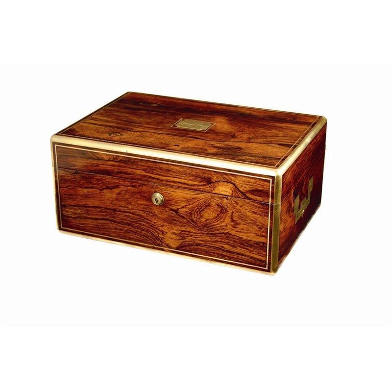 A George IV rosewood and brass mounted box, the top with inset plaque inscribed 'Sir George A Arney', the green leather lined interior with a pouch to the lid stamped 'Edwards Manufacturer, 21 King Street, Bloomsbury, London', the brass lock stamped 'Bramah, Piccadilly', sunken brass side carrying handles, 6.5in (16.5in) h, 13.75in (35cm) w, 10in (25.5cm) d.