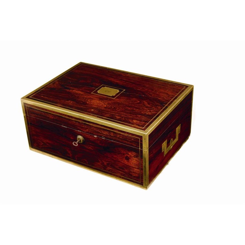 A George IV rosewood and brass bound toilet box, with sunken side handles, the top initialled 'E.C.' the green leather interior with an easel mirror, stamped 'Edwards, 21 King Strt, Holborn,' to a pouch, silver topped cut glass bottles and boxes, inkwell and other accoutrements, fitted in lift out trays, the silver hallmarked London 1823/24/25, 6in (15cm) h, 13.25in (33.5cm) w.