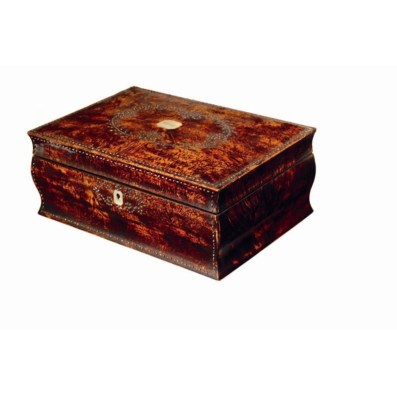 A 19th century continental burr birch and steel mounted work box, the hinged cover inset a mother of pearl plaque inscribed 'Emily', with a vacant paper lined interior the brass lock stamped 'WB', 4.75in (12cm) h, 12.25in (31cm) w, 8.5in (21.5cm) d.