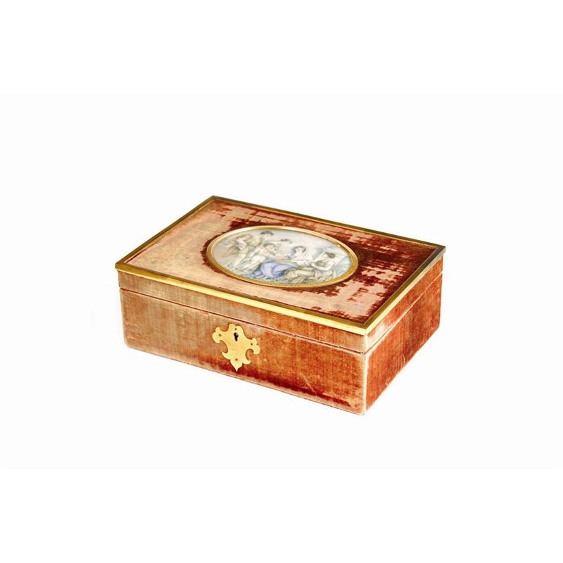 A 19th century plush and gilt brass mounted jewellery box, the cover inset a painted ivory oval panel, a classical scene, the mount inscribed 'Et Haec Inquit Ornamenta Sunt Mea,' with a silk lined interior, 3.25in (8cm) h, 9in (23cm) w, 6in (15cm) d.