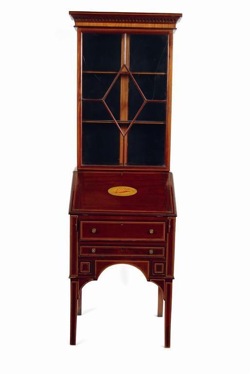 An Edwardian mahogany bureau bookcase, inlaid stringing and a marquetry conch shell, 74in (188cm) h, 26in (65.9cm) w, 21.75in (55cm) d. Three glass panels cracked, two brackets loose.