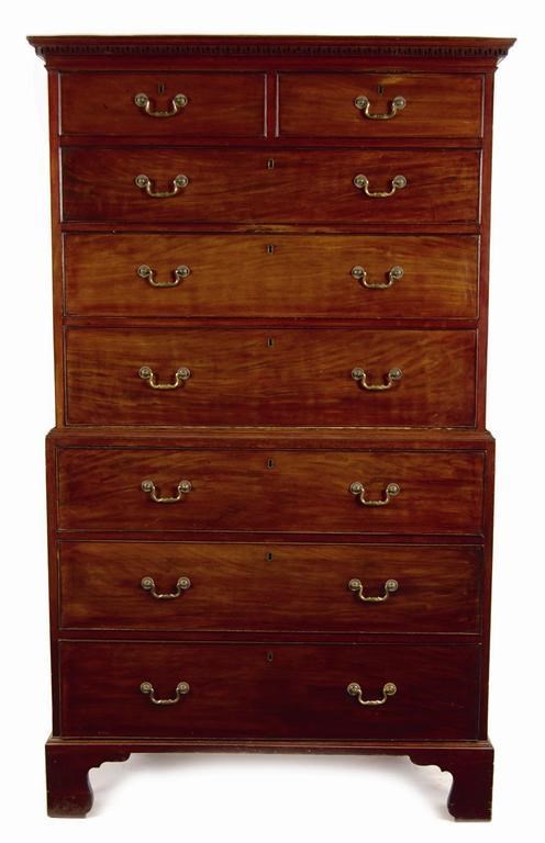 A late George III mahogany chest on chest, having oak lined drawers, 73.75in (187cm) h, 43.75in (111cm) w, 22.5in (57cm) d. Old restoration, cracks to left and right side of top half.