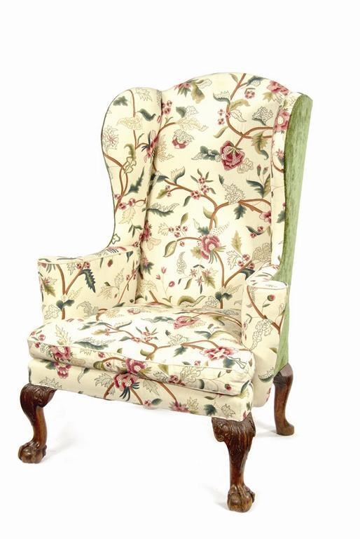 A walnut wing armchair, upholstered modern crewel work, on acanthus carved cabriole front legs and claw and ball feet, previously on castors, 18th century and later. Old chips and losses.