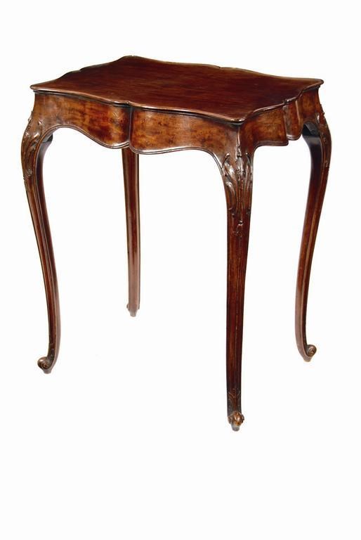 An 18th century style mahogany silver table, the shaped rectangular top with a raised edge on conforming frieze with leaf carved slender cabriole legs to leaf and knurled toes, 28.25in (71.5cm) h, 22.5in (57cm) w, 17.25in (44cm) d.