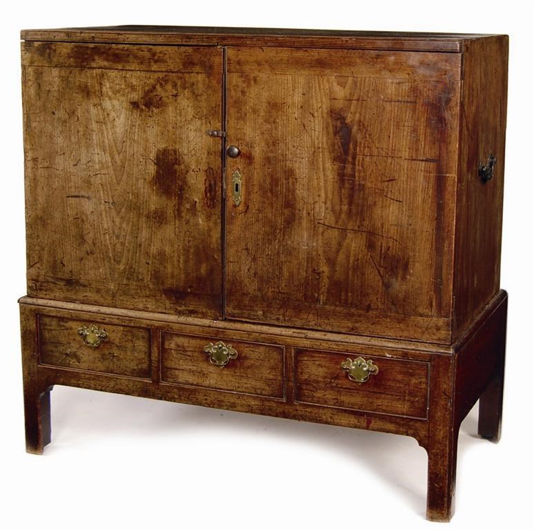 An 18th century walnut press on stand, the cleated hinge doors revealing later slides, brass side carrying handles on a three drawer stand with bracketed moulded square legs previously with castors, 47.25in (120cm) h, 49.25in (125cm) w, 24.5in (62cm) d.
