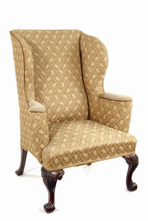 A carved mahogany wing armchair, on patera capped front cabriole legs to scroll feet, previously on castors, 18th century and later. Old damages and restoration.