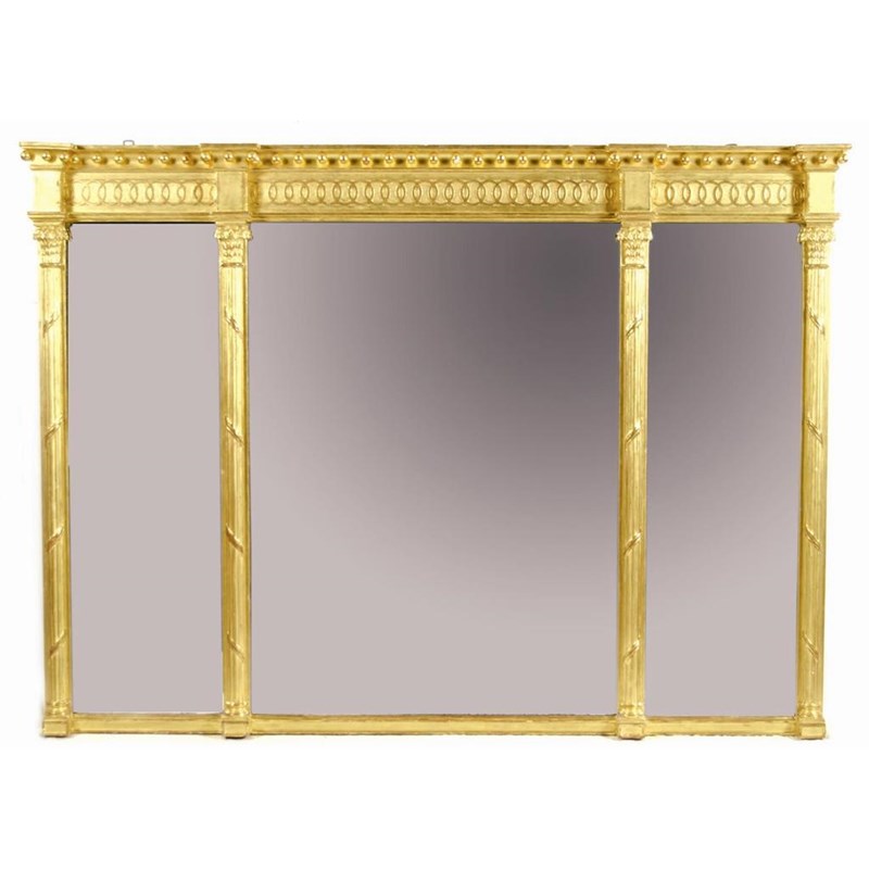 A large Regency style giltwood overmantel mirror, the ball cornice above a carved frieze, the rectangular plates divided by cluster columns, late 19th century, 52in (132.2cm) h, 71.75in (182.4cm) w. Plates spotted.