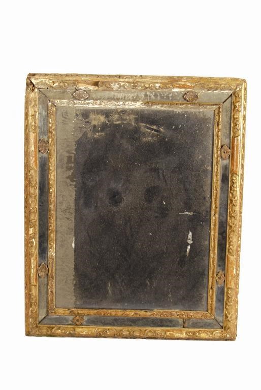 An 18th century Italian giltwood wall mirror, the leaf carved frame to marginal plates and applied flower heads, 37.5 x 30in (95.4 x 76.2cm). Old worm and damages to frame.
