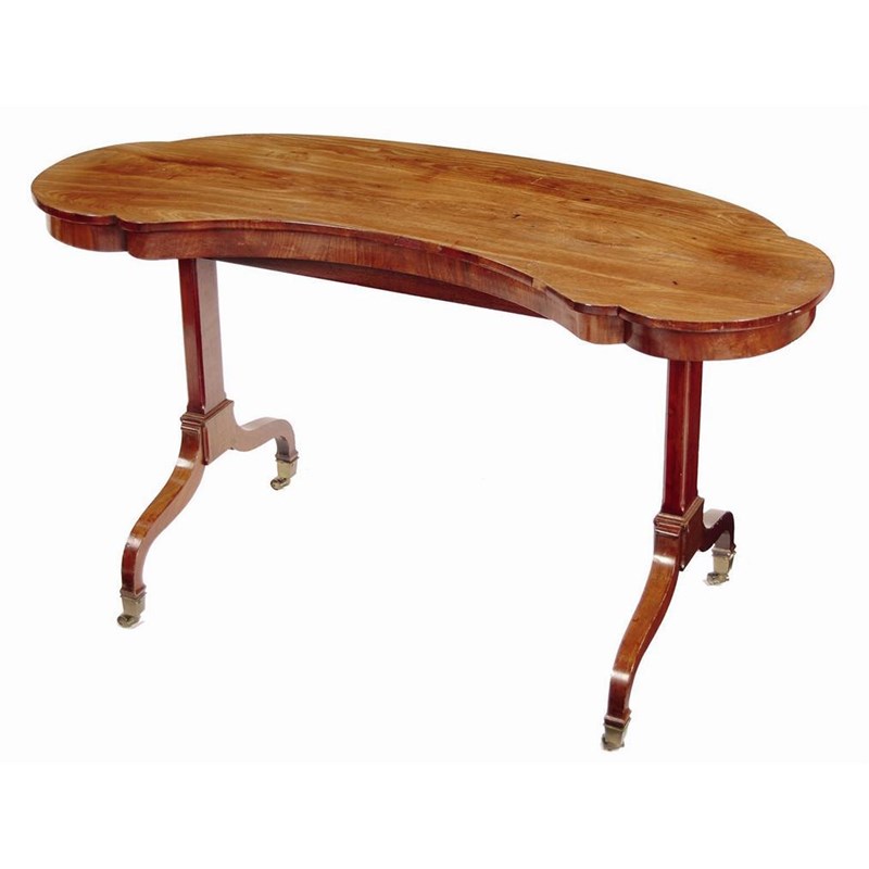A mahogany table, the kidney shape top on chamfered trestle ends united by a stretcher on downswept legs to brass caps and roller castors, George III and later, 29.5in (74.8cm) h, 52.75in (134cm) w, 22.75in (57.7cm) d.