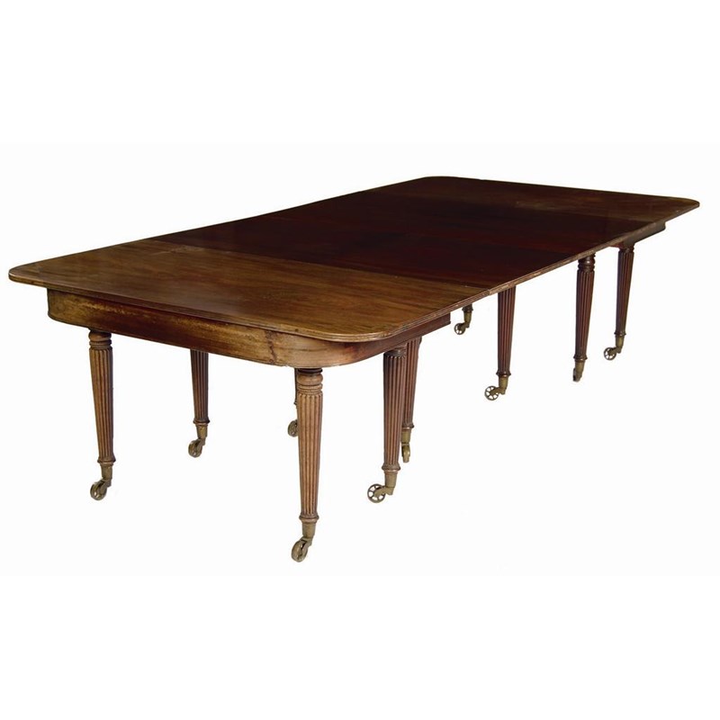 A late Regency mahogany extending dining table, with a pair of ends with rounded corners and a telescope frame, having five leaves with a reeded edge, on turned and ribbed tapering legs with brass spoke castors, 28.5in (72.5cm) h 173in (439.5cm) extended, 53.5in (136cm) w. The leaves are housed in a cradle, the corners of the ends having been tipped, cracked to the frieze front.
