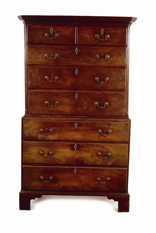 A George III mahogany chest on chest, the two short and six long graduated drawers fitted gilt brass pierced rococo escutcheons and foliage cast gilt brass swan neck handles, the top half with fluted angles on bracket feet, 73.75in (187cm) h, 44in (111.5cm) w, 23.5in (59.5cm) d.