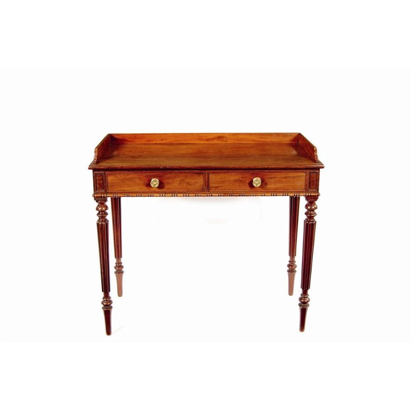 An early 19th century mahogany washstand, the later 3/4 gallery above two frieze drawers with fitted brass knob handles, on turned and ribbed tapering legs, 32.5in (81.8cm) h, 37in (94cm) w, 19.75in (50.2cm) d.